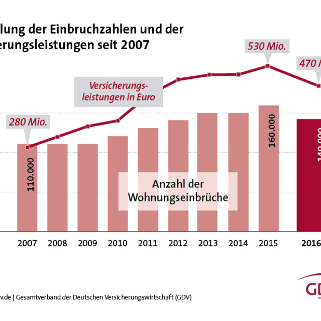 Konkret: Von den durchschnittlich 140.000 Einbruchschäden, die von 2002 bis 2015 jährlich an die Versicherer gemeldet wurden, entfielen 40 Prozent auf das Sommerhalbjahr und 60 Prozent auf die dunkle Jahreszeit. Die Zahlen des Verbands weisen für das zurückliegende Jahr, erstmals seit 10 Jahren, einen leichten Rückgang der gemeldeten Einbrüche aus, ebenso verringerten sich die Schadenzahlungen von 530 Millionen (2015) auf 470 Millionen Euro (2016).